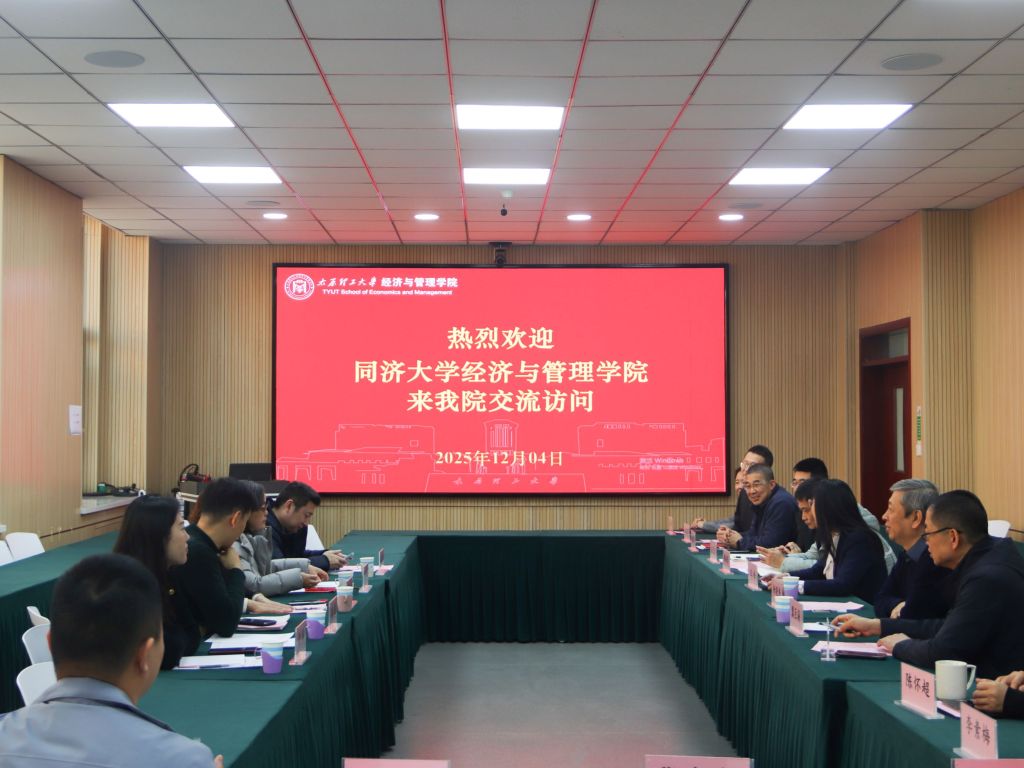 2025年12月4日上午,同济大学经济与管理学院党委副书记董变林一行莅临太原理工大学经济与管理学院,于学院229会议室就学生党建工作、人才培养工作等方面进行座谈交流。副校长杨晓伟、研究生院副院长冀巨海、经济与管理学院全体院领导出席座谈,系主任、青年教师代表及全体辅导员参加座谈,会议由院党委书记闫新主持。