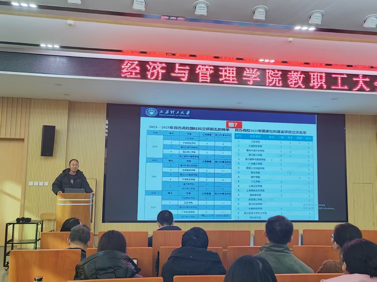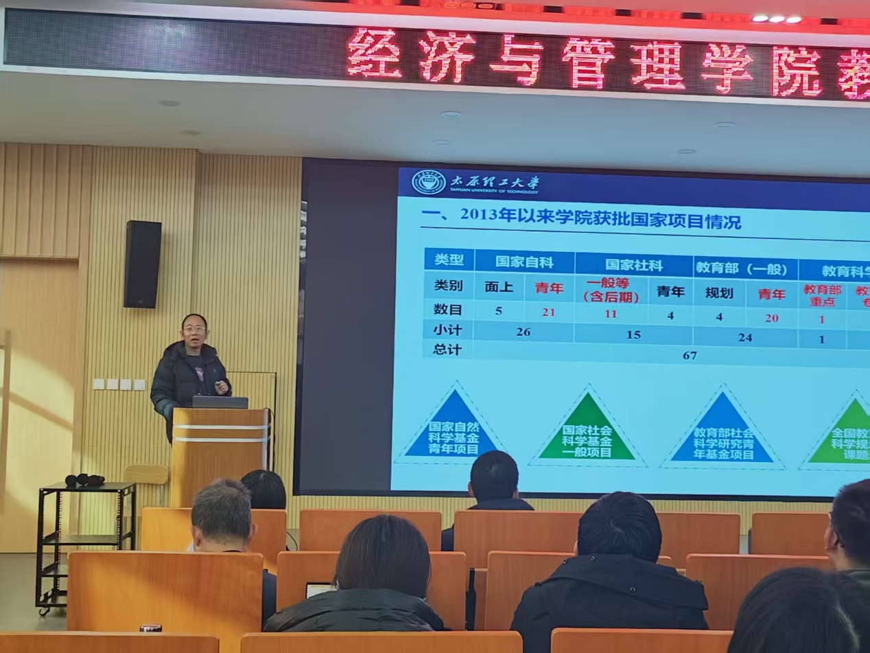 11月25日,经济与管理学院召开2026年国家级项目申报动员会。副院长陈怀超教授作动员报告,系统梳理2013年以来学院获批国家自科、国家社科等国家级项目成果,对比分析近年立项趋势,指出“有组织科研”是突围关键。他围绕“为什么报、报什么、怎么报”,从政策导向、选题凝练、团队组建、标书打磨四维度作详细辅导,表示学院后续将开展系列专家辅导,全力护航申报。与会教师反响热烈,纷纷表示将紧扣国家需求,力争在2026年立项数实现新突破。