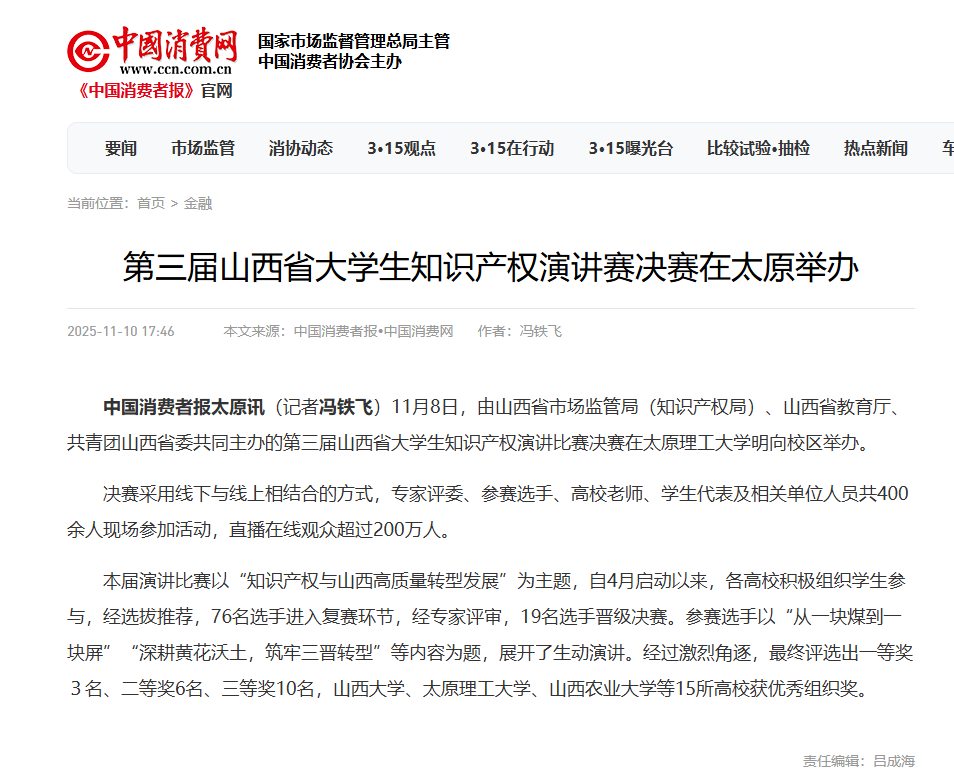 本届演讲比赛以“知识产权与山西高质量转型发展”为主题,自4月启动以来,各高校积极组织学生参与,经选拔推荐,76名选手进入复赛环节,经专家评审,19名选手晋级决赛。参赛选手以“从一块煤到一块屏”“深耕黄花沃土,筑牢三晋转型”等内容为题,展开了生动演讲。经过激烈角逐,最终评选出一等奖3名、二等奖6名、三等奖10名,山西大学、太原理工大学、山西农业大学等15所高校获优秀组织奖。