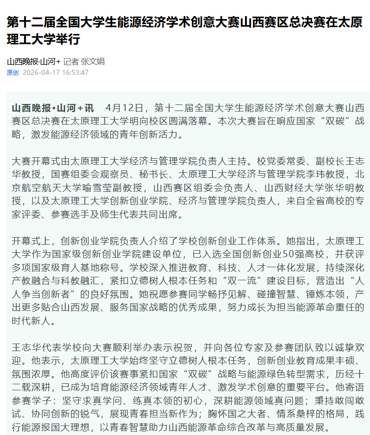 4月12日,第十二届全国大学生能源经济学术创意大赛山西赛区总决赛在太原理工大学明向校区圆满落幕。本次大赛旨在响应国家“双碳”战略,激发能源经济领域的青年创新活力。