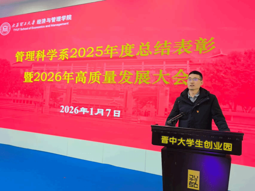 1月7日,管理科学系在晋中大学生创业园开展“校企联合・党建赋能”主题党日期间,隆重召开“2025总结表彰暨2026高质量发展大会”。学院党委书记闫新、院长栗继祖教授、副书记杨振东、副院长陈怀超教授、副院长兼管理科学系主任王天日教授和管科系教师出席,会议由系副主任何学松副教授主持。