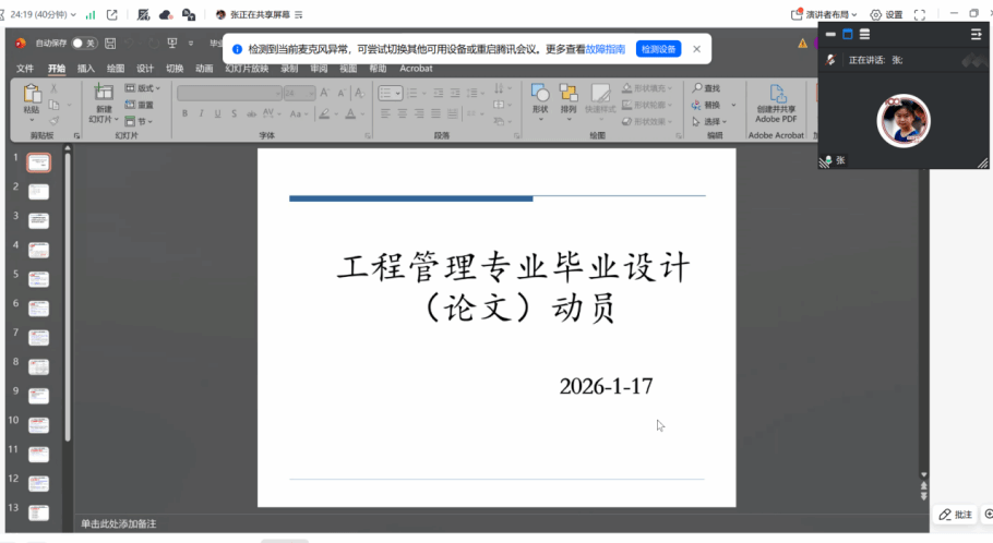 院长栗继祖教授强调了毕业论文(设计)的重要性,要求大家提高认识,提醒不能过度使用AI,指出工程管理专业毕业授予学位正在由管理学向工学过渡,号召提高毕业设计比重,指出毕业设计对以后从事工程行业实际工作大有裨益,要求题目要有针对性和新颖性,要进行案例研究。